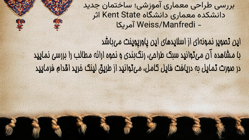 پاورپوینت کامل بررسی طراحی معماری آموزشی؛ ساختمان جدید دانشکده معماری دانشگاه Kent State اثر Weiss/Manfredi – آمریکا