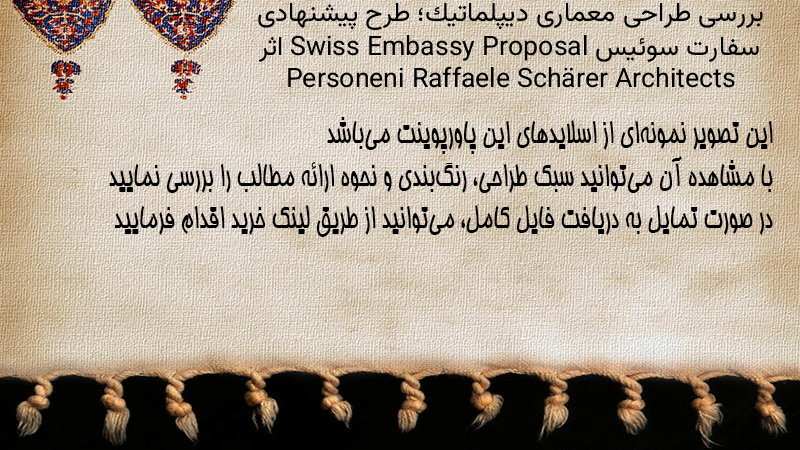 پاورپوینت کامل بررسی طراحی معماری دیپلماتیک؛ طرح پیشنهادی سفارت سوئیس Swiss Embassy Proposal اثر Personeni Raffaele Schärer Architects