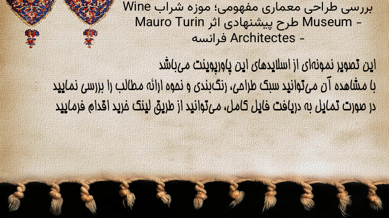 پاورپوینت کامل بررسی طراحی معماری مفهومی؛ موزه شراب Wine Museum – طرح پیشنهادی اثر Mauro Turin Architectes – فرانسه