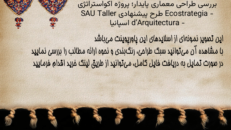 پاورپوینت کامل بررسی طراحی معماری پایدار؛ پروژه اکواستراتژی Ecostrategia – طرح پیشنهادی SAU Taller d’Arquitectura – اسپانیا