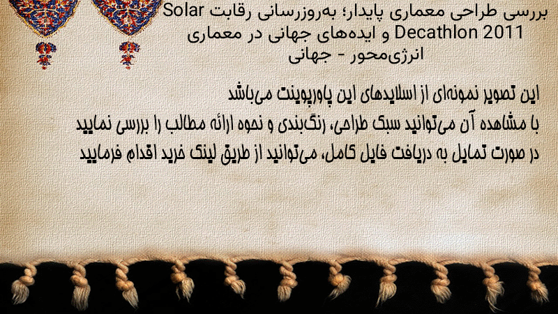 پاورپوینت کامل بررسی طراحی معماری پایدار؛ بهروزرسانی رقابت Solar Decathlon 2011 و ایدههای جهانی در معماری انرژیمحور – جهانی