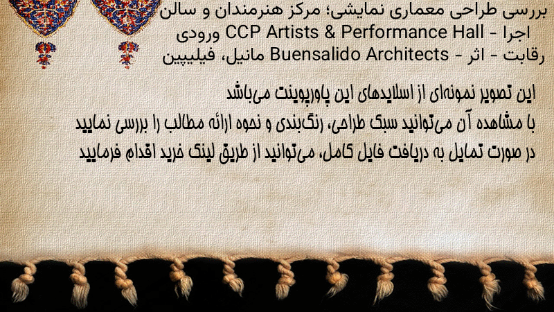 پاورپوینت کامل بررسی طراحی معماری نمایشی؛ مرکز هنرمندان و سالن اجرا CCP Artists & Performance Hall – ورودی رقابت – اثر Buensalido Architects – مانیل، فیلیپین