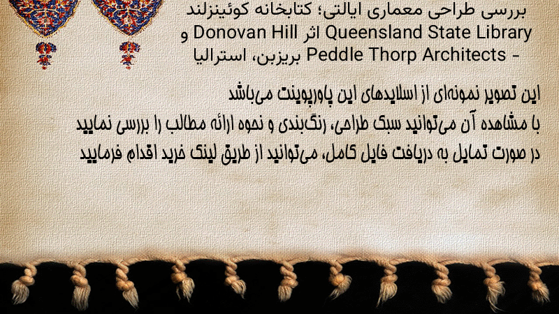 پاورپوینت کامل بررسی طراحی معماری ایالتی؛ کتابخانه کوئینزلند Queensland State Library اثر Donovan Hill و Peddle Thorp Architects – بریزبن، استرالیا