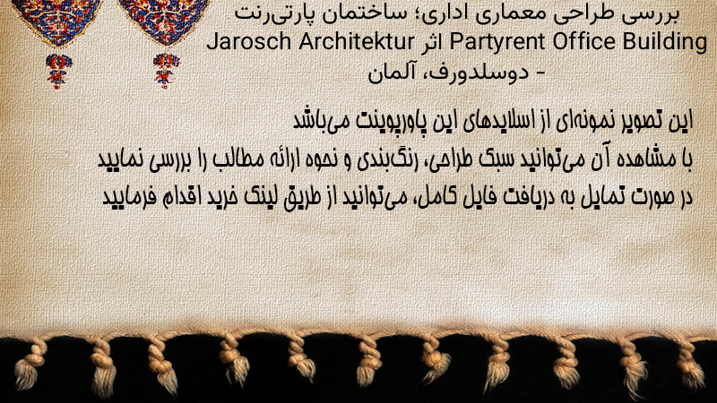 پاورپوینت کامل بررسی طراحی معماری اداری؛ ساختمان پارتیرنت Partyrent Office Building اثر Jarosch Architektur – دوسلدورف، آلمان