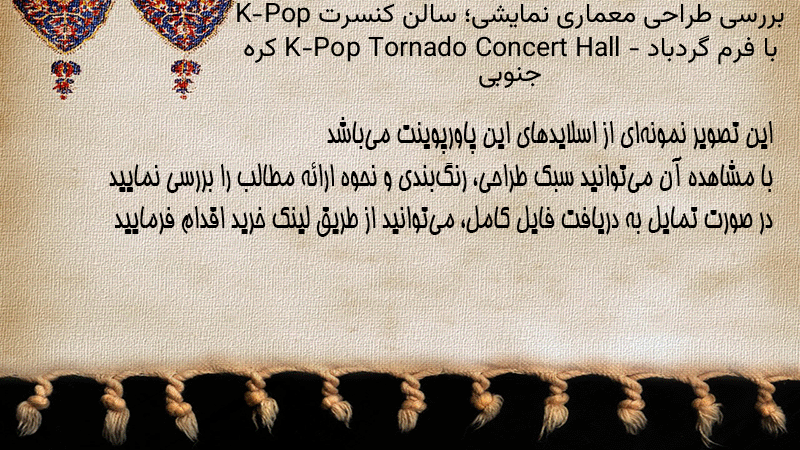 پاورپوینت کامل بررسی طراحی معماری نمایشی؛ سالن کنسرت K-Pop با فرم گردباد K-Pop Tornado Concert Hall – کره جنوبی