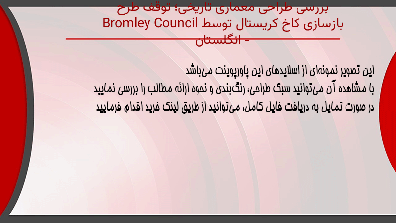 پاورپوینت کامل بررسی طراحی معماری تاریخی؛ توقف طرح بازسازی کاخ کریستال توسط Bromley Council – انگلستان