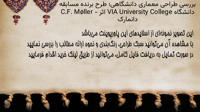 پاورپوینت کامل بررسی طراحی معماری دانشگاهی؛ طرح برنده مسابقه دانشگاه VIA University College اثر C.F. Møller – دانمارک