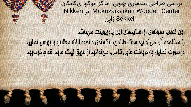 پاورپوینت کامل بررسی طراحی معماری چوبی؛ مرکز موکوزایکایکان Mokuzaikaikan Wooden Center اثر Nikken Sekkei – ژاپن