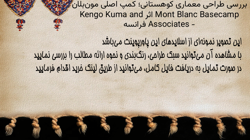 پاورپوینت کامل بررسی طراحی معماری کوهستانی؛ کمپ اصلی مونبلان Mont Blanc Basecamp اثر Kengo Kuma and Associates – فرانسه