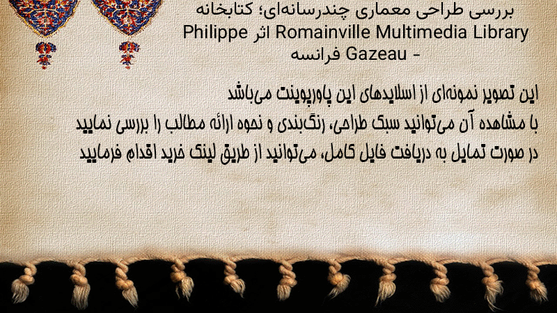 پاورپوینت کامل بررسی طراحی معماری چندرسانهای؛ کتابخانه Romainville Multimedia Library اثر Philippe Gazeau – فرانسه