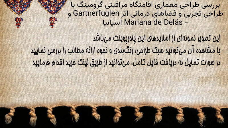 پاورپوینت کامل بررسی طراحی معماری اقامتگاه مراقبتی گرومینگ با طراحی تجربی و فضاهای درمانی اثر Gartnerfuglen و Mariana de Delás – اسپانیا