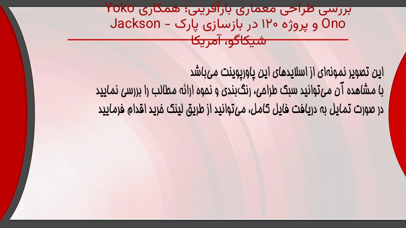پاورپوینت کامل بررسی طراحی معماری بازآفرینی؛ همکاری Yoko Ono و پروژه ۱۲۰ در بازسازی پارک Jackson – شیکاگو، آمریکا