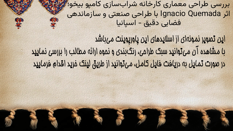 پاورپوینت کامل بررسی طراحی معماری کارخانه شرابسازی کامپو بیخو؛ اثر Ignacio Quemada با طراحی صنعتی و سازماندهی فضایی دقیق – اسپانیا