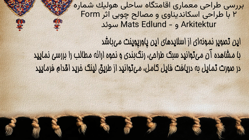 پاورپوینت کامل بررسی طراحی معماری اقامتگاه ساحلی هولیک شماره ۲ با طراحی اسکاندیناوی و مصالح چوبی اثر Form Arkitektur و Mats Edlund – سوئد