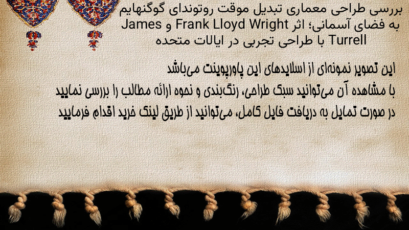 پاورپوینت کامل بررسی طراحی معماری تبدیل موقت روتوندای گوگنهایم به فضای آسمانی؛ اثر Frank Lloyd Wright و James Turrell با طراحی تجربی در ایالات متحده