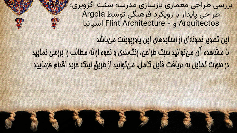 پاورپوینت کامل بررسی طراحی معماری بازسازی مدرسه سنت اگزوپری؛ طراحی پایدار با رویکرد فرهنگی توسط Argola Arquitectos و Flint Architecture – اسپانیا