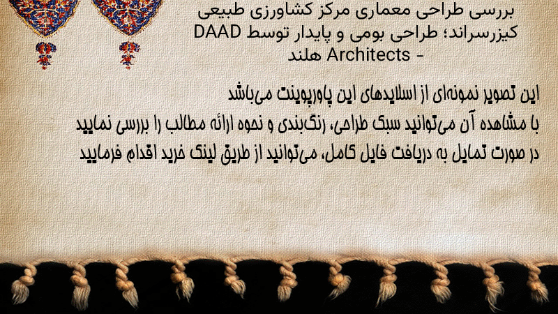 پاورپوینت کامل بررسی طراحی معماری مرکز کشاورزی طبیعی کیزرسراند؛ طراحی بومی و پایدار توسط DAAD Architects – هلند