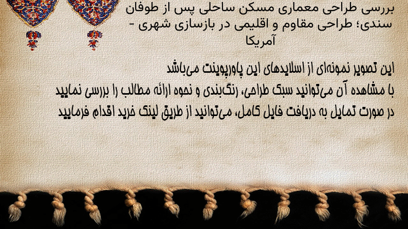 پاورپوینت کامل بررسی طراحی معماری مسکن ساحلی پس از طوفان سندی؛ طراحی مقاوم و اقلیمی در بازسازی شهری – آمریکا