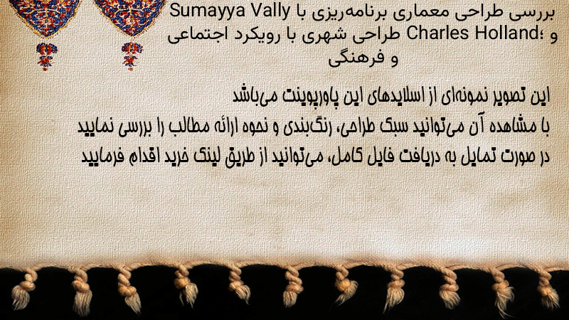پاورپوینت کامل بررسی طراحی معماری برنامهریزی با Sumayya Vally و Charles Holland؛ طراحی شهری با رویکرد اجتماعی و فرهنگی