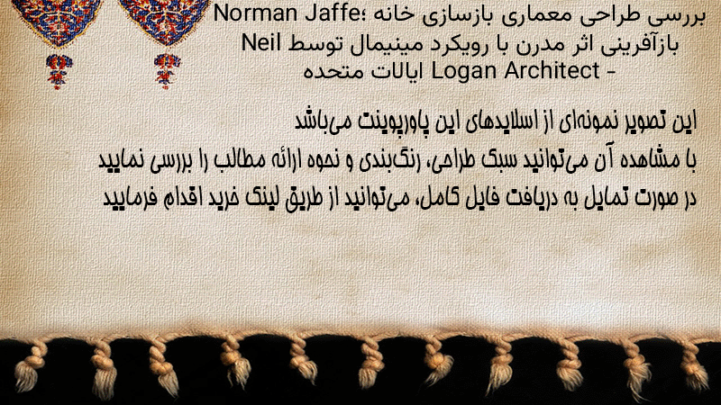 پاورپوینت کامل بررسی طراحی معماری بازسازی خانه Norman Jaffe؛ بازآفرینی اثر مدرن با رویکرد مینیمال توسط Neil Logan Architect – ایالات متحده