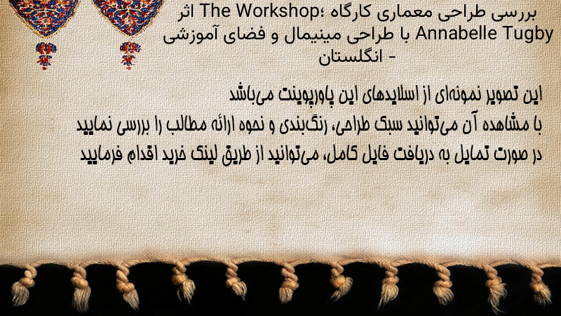 پاورپوینت کامل بررسی طراحی معماری کارگاه The Workshop؛ اثر Annabelle Tugby با طراحی مینیمال و فضای آموزشی – انگلستان