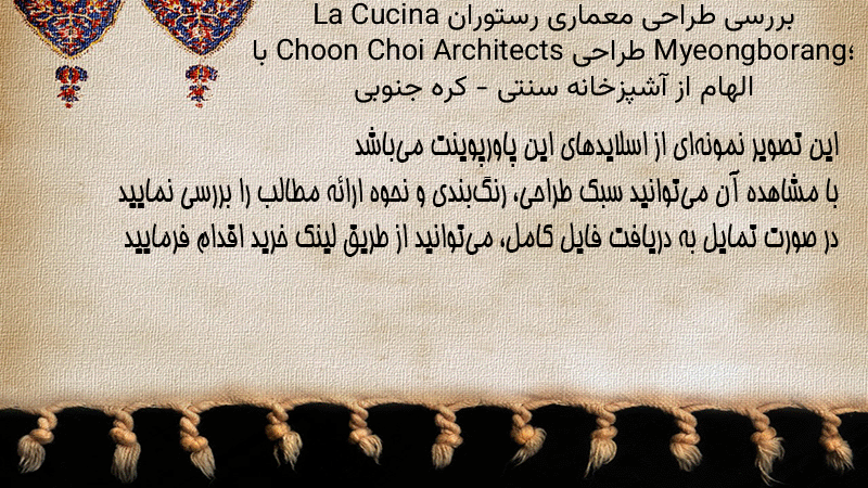 پاورپوینت کامل بررسی طراحی معماری رستوران La Cucina Myeongborang؛ طراحی Choon Choi Architects با الهام از آشپزخانه سنتی – کره جنوبی