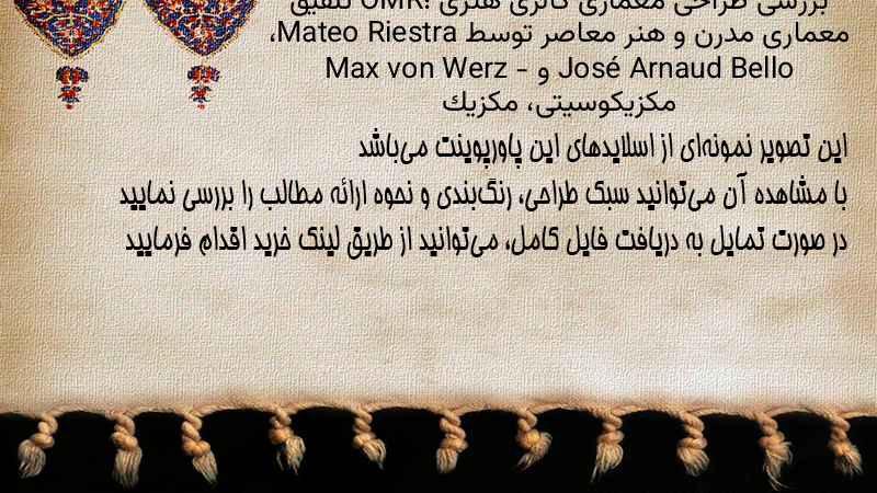 پاورپوینت کامل بررسی طراحی معماری گالری هنری OMR؛ تلفیق معماری مدرن و هنر معاصر توسط Mateo Riestra، José Arnaud Bello و Max von Werz – مکزیکوسیتی، مکزیک