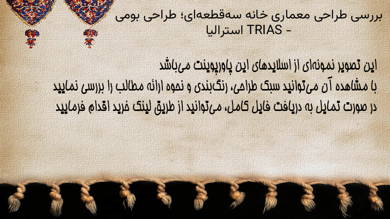 پاورپوینت کامل بررسی طراحی معماری خانه سهقطعهای؛ طراحی بومی TRIAS – استرالیا