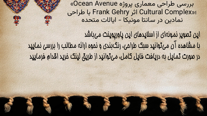 پاورپوینت کامل بررسی طراحی معماری پروژه «Ocean Avenue Cultural Complex»؛ اثر Frank Gehry با طراحی نمادین در سانتا مونیکا – ایالات متحده
