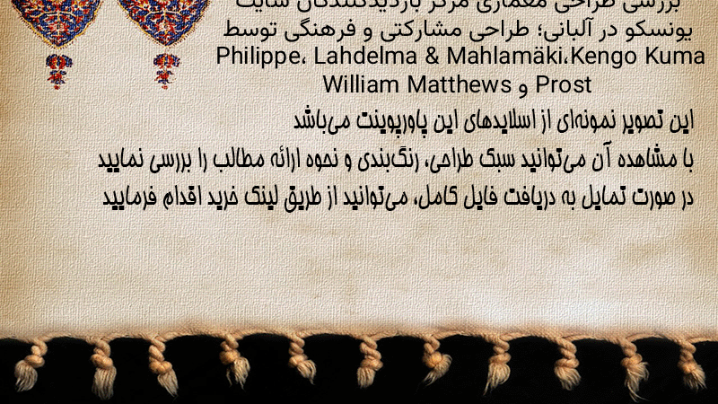 پاورپوینت کامل بررسی طراحی معماری مرکز بازدیدکنندگان سایت یونسکو در آلبانی؛ طراحی مشارکتی و فرهنگی توسط Kengo Kuma، Lahdelma & Mahlamäki، Philippe Prost و William Matthews