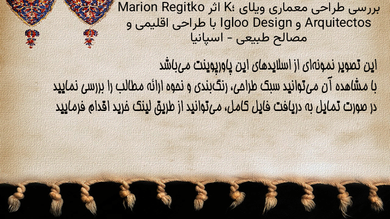 پاورپوینت کامل بررسی طراحی معماری ویلای K؛ اثر Marion Regitko Arquitectos و Igloo Design با طراحی اقلیمی و مصالح طبیعی – اسپانیا