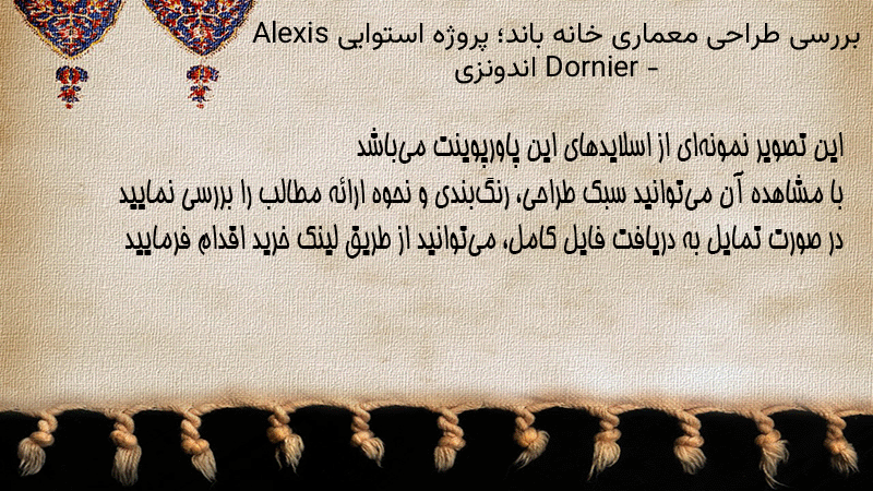 پاورپوینت کامل بررسی طراحی معماری خانه باند؛ پروژه استوایی Alexis Dornier – اندونزی
