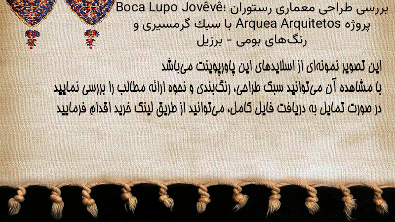 پاورپوینت کامل بررسی طراحی معماری رستوران Boca Lupo Jovêvê؛ پروژه Arquea Arquitetos با سبک گرمسیری و رنگهای بومی – برزیل