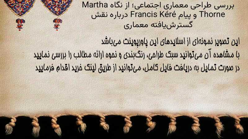 پاورپوینت کامل بررسی طراحی معماری اجتماعی؛ از نگاه Martha Thorne و پیام Francis Kéré درباره نقش گسترشیافته معماری