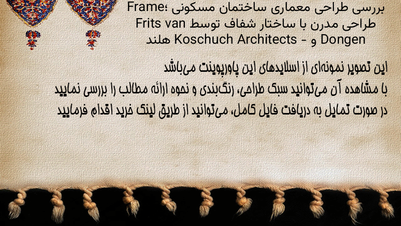 پاورپوینت کامل بررسی طراحی معماری ساختمان مسکونی Frame؛ طراحی مدرن با ساختار شفاف توسط Frits van Dongen و Koschuch Architects – هلند