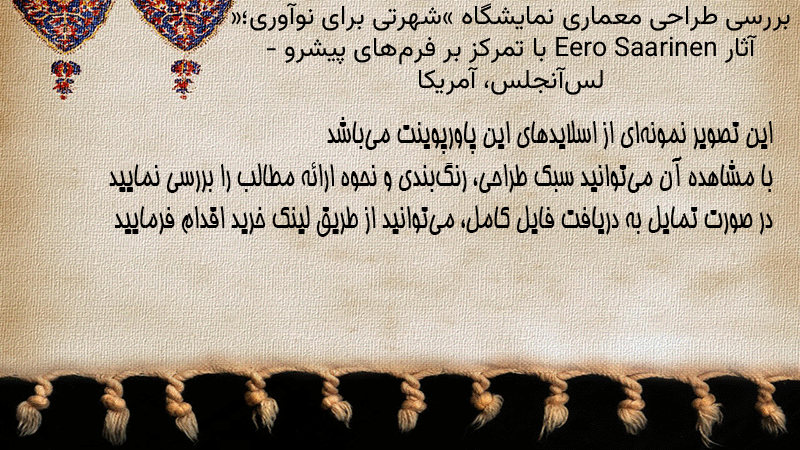 پاورپوینت کامل بررسی طراحی معماری نمایشگاه «شهرتی برای نوآوری»؛ آثار Eero Saarinen با تمرکز بر فرمهای پیشرو – لسآنجلس، آمریکا