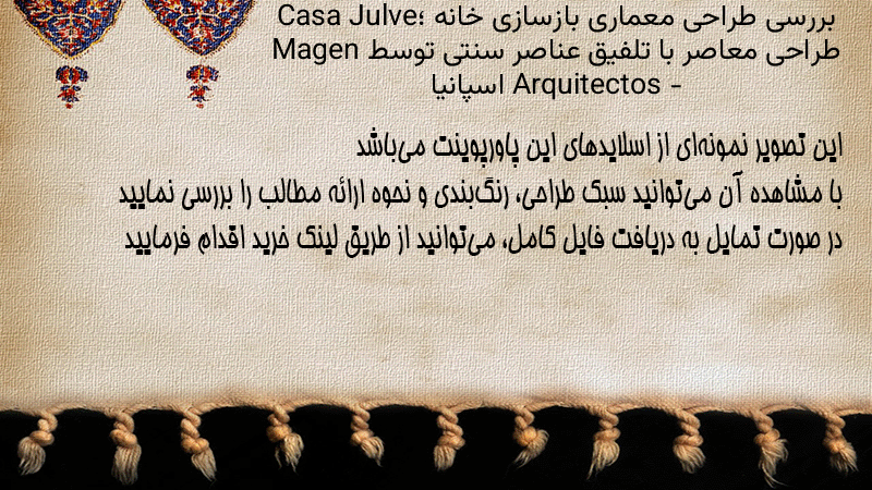 پاورپوینت کامل بررسی طراحی معماری بازسازی خانه Casa Julve؛ طراحی معاصر با تلفیق عناصر سنتی توسط Magen Arquitectos – اسپانیا