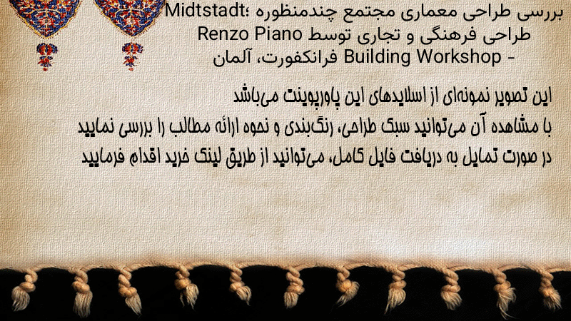 پاورپوینت کامل بررسی طراحی معماری مجتمع چندمنظوره Midtstadt؛ طراحی فرهنگی و تجاری توسط Renzo Piano Building Workshop – فرانکفورت، آلمان