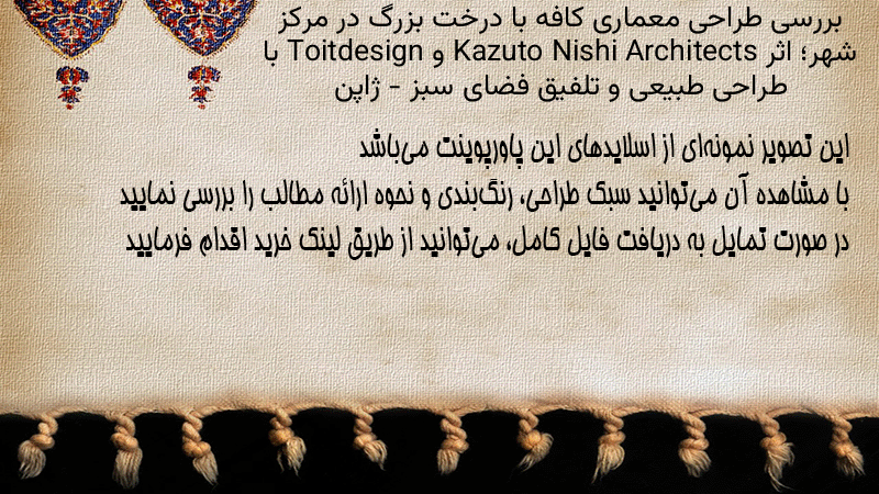 پاورپوینت کامل بررسی طراحی معماری کافه با درخت بزرگ در مرکز شهر؛ اثر Kazuto Nishi Architects و Toitdesign با طراحی طبیعی و تلفیق فضای سبز – ژاپن