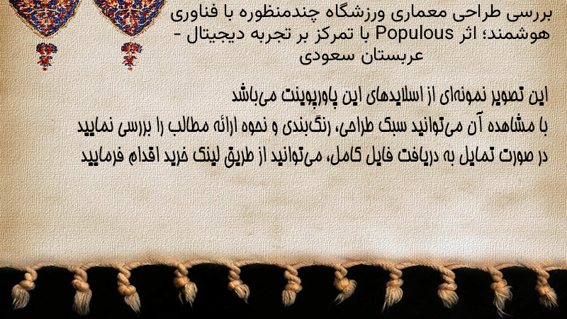 پاورپوینت کامل بررسی طراحی معماری ورزشگاه چندمنظوره با فناوری هوشمند؛ اثر Populous با تمرکز بر تجربه دیجیتال – عربستان سعودی
