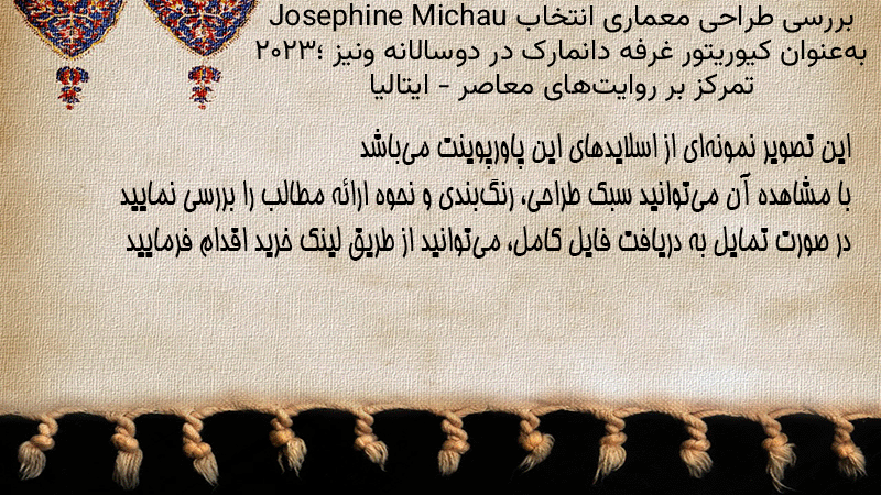 پاورپوینت کامل بررسی طراحی معماری انتخاب Josephine Michau بهعنوان کیوریتور غرفه دانمارک در دوسالانه ونیز ۲۰۲۳؛ تمرکز بر روایتهای معاصر – ایتالیا