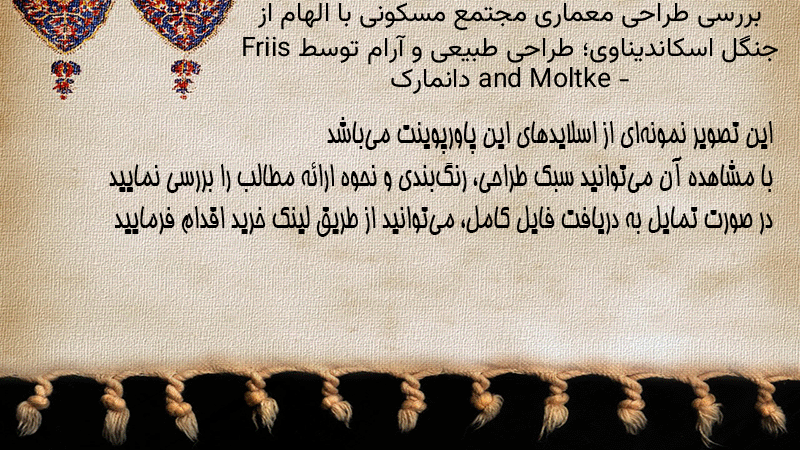 پاورپوینت کامل بررسی طراحی معماری مجتمع مسکونی با الهام از جنگل اسکاندیناوی؛ طراحی طبیعی و آرام توسط Friis and Moltke – دانمارک