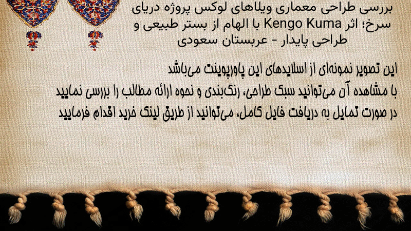 پاورپوینت کامل بررسی طراحی معماری ویلاهای لوکس پروژه دریای سرخ؛ اثر Kengo Kuma با الهام از بستر طبیعی و طراحی پایدار – عربستان سعودی