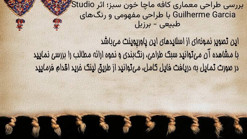 پاورپوینت کامل بررسی طراحی معماری کافه ماچا خون سبز؛ اثر Studio Guilherme Garcia با طراحی مفهومی و رنگهای طبیعی – برزیل
