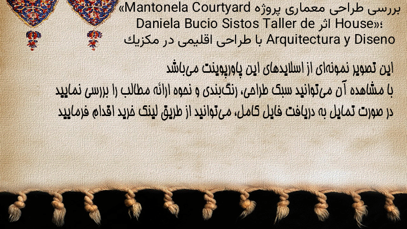 پاورپوینت کامل بررسی طراحی معماری پروژه «Mantonela Courtyard House»؛ اثر Daniela Bucio Sistos Taller de Arquitectura y Diseno با طراحی اقلیمی در مکزیک