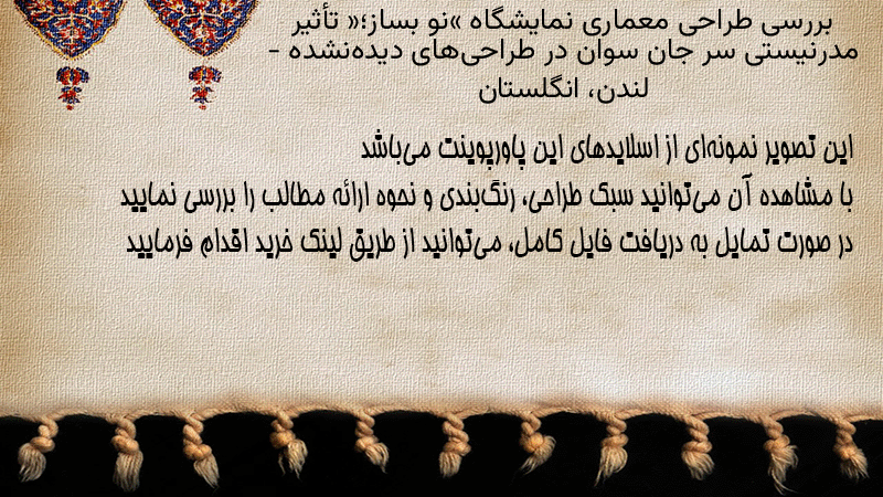 پاورپوینت کامل بررسی طراحی معماری نمایشگاه «نو بساز»؛ تأثیر مدرنیستی سر جان سوان در طراحیهای دیدهنشده – لندن، انگلستان