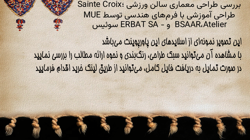 پاورپوینت کامل بررسی طراحی معماری سالن ورزشی Sainte Croix؛ طراحی آموزشی با فرمهای هندسی توسط MUE Atelier، BSAAR و ERBAT SA – سوئیس