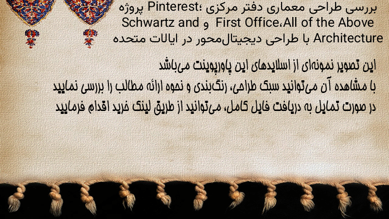پاورپوینت کامل بررسی طراحی معماری دفتر مرکزی Pinterest؛ پروژه All of the Above، First Office و Schwartz and Architecture با طراحی دیجیتالمحور در ایالات متحده