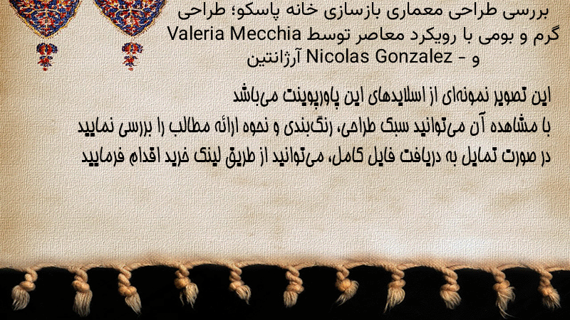 پاورپوینت کامل بررسی طراحی معماری بازسازی خانه پاسکو؛ طراحی گرم و بومی با رویکرد معاصر توسط Valeria Mecchia و Nicolas Gonzalez – آرژانتین