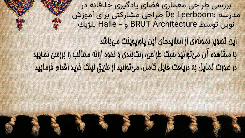 پاورپوینت کامل بررسی طراحی معماری فضای یادگیری خلاقانه در مدرسه De Leerboom؛ طراحی مشارکتی برای آموزش نوین توسط BRUT Architecture و Halle – بلژیک